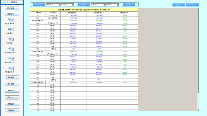 系统以丰富的数据报表体现计量体系的完整性。系统具备各回路定时抄表汇总统计功能,用户可以自由查询自系统正常运行以来任意时间段内各配电节点的用电情况,即该节点进线用电量与各分支回路消耗电量的统计分析报表。该功能使得用电可视透明,并在用电误差偏大时可追溯,维护计量体系的正确性。
