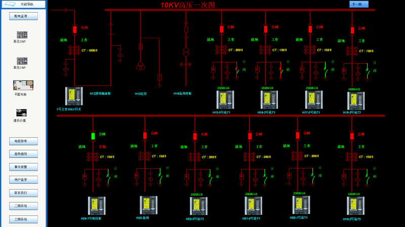 功能要求:高压回路的一次图界面应显示回路名称、三相电流、三相线电压、总有功功率、总无功功率、总功率因数、频率和开关量光字牌。10kV配电系统中所需要监测的开关量为:断路器分合闸信号、手车工作/试验位置信号、远方/就地切换位置信号、弹簧储能位信号、接地刀信号、高温跳闸信号、高温报警信号、事故信号和预告报警信号;低压进线回路电参量界面显示:回路名称、开关状态、三相电流、三相电压、总有功功率、总无功功率、总功率因数、频率和正向有功电能累计值。低压出线回路界面显示:回路名称、开关状态、三相(单相)电流。每个回路旁设置详细参数按钮,通过点击可查看该回路详细电参量,包括三相电流、三相电压、总有功功率、分相有功功率、总无功功率、分相无功功率、总功率因数、分相功率因数、频率、正向有功电能、反向有功电能、感性无功电能、容性无功电能。