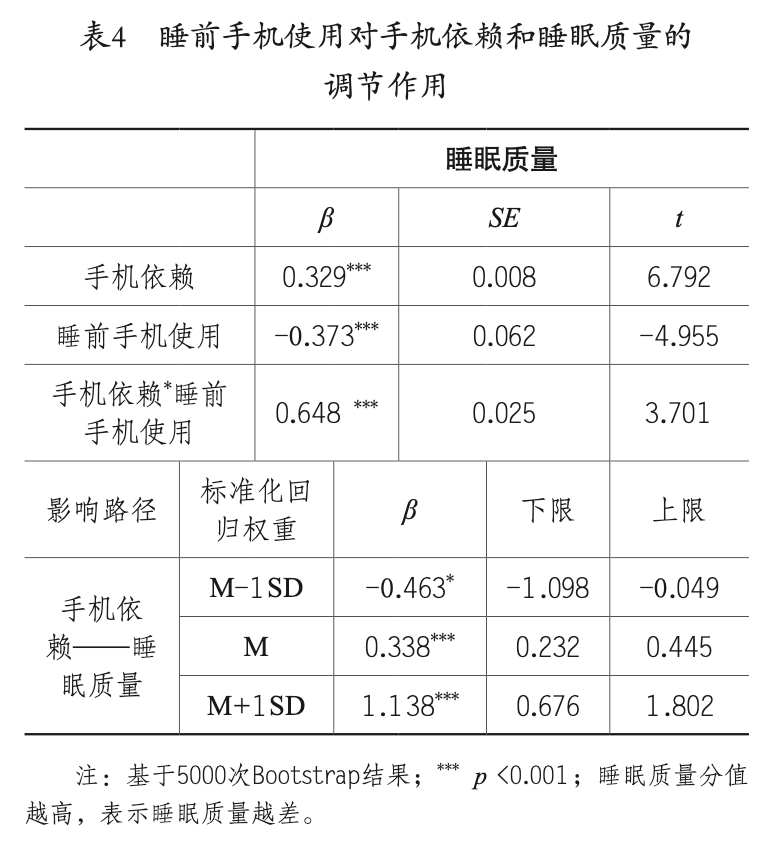 RQ3.1:青少年的睡前手机使用是否在手机依赖水平和睡眠质量之间起调节作用?