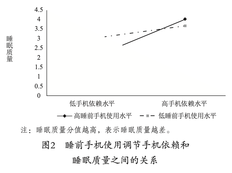 具体而言,根据简单斜率分析(见图2),对睡前使用手机多的青少年而言,手机依赖对睡眠质量的影响更大;而睡前使用手机少的青少年,手机依赖对睡眠质量的影响相对较小。因此,睡前手机使用对手机依赖和睡眠质量之间的关系起到了调节作用。