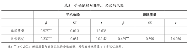 对青少年而言,睡眠过程中大脑的活动促进记忆的形成、储存与巩固[26],而手机依赖导致的睡眠减少将影响这一过程,从而降低其日常记忆水平。此外,对于许多学生来说,手机依赖还可能造成长期的负面影响,手机可以视作扩展记忆体,也是记录事实与信息的便捷存储设备,因此,过度依赖手机可能降低个体的认知能力。