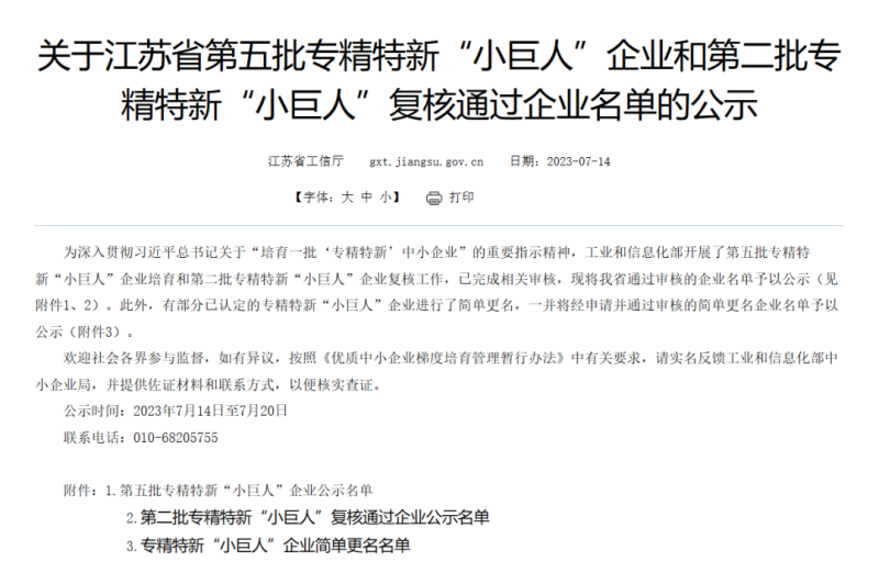 近日,根据工信部统一部署,江苏省工信厅发布了《关于江苏省第五批专精特新“小巨人”企业和第二批专精特新“小巨人”复核通过企业名单的公示》。