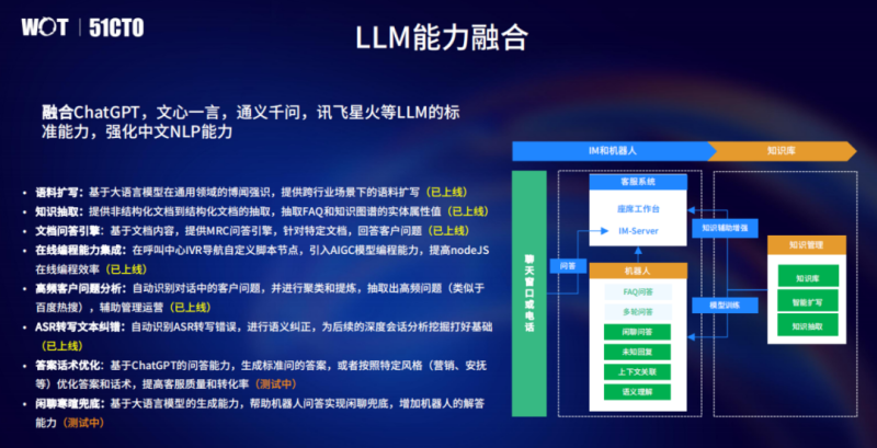 当前,我们融合ChatGPT、文心一言、通义千问等LLM的能力,上线了语料扩写、知识抽取、文档问答引擎等功能,另外,还有话术优化、闲聊寒喧兜底等功能在测试中。