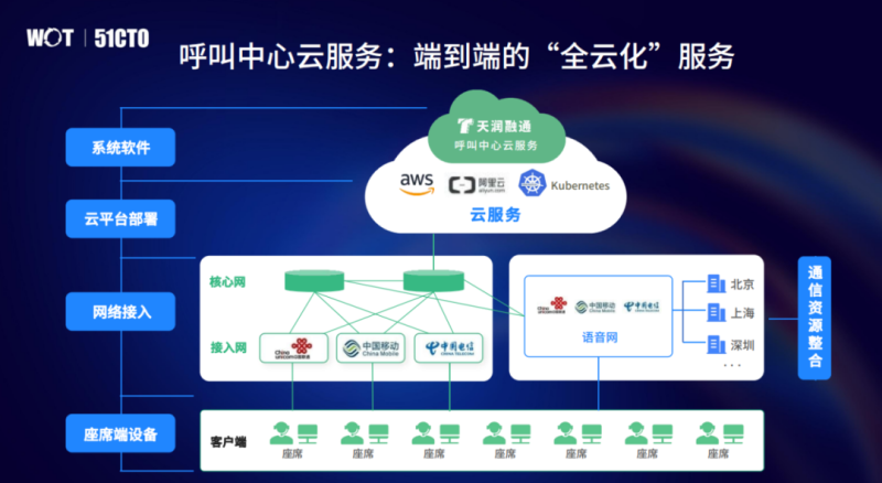 所谓“端到端与全云化”,简单解释,即呼叫中心云服务是全链路的.端到端包含五个层次:系统软件、云平台部署、网络接入、座席端设备,以及通信资源整合。其中任何环节出问题,平台对客户来讲就不能用。