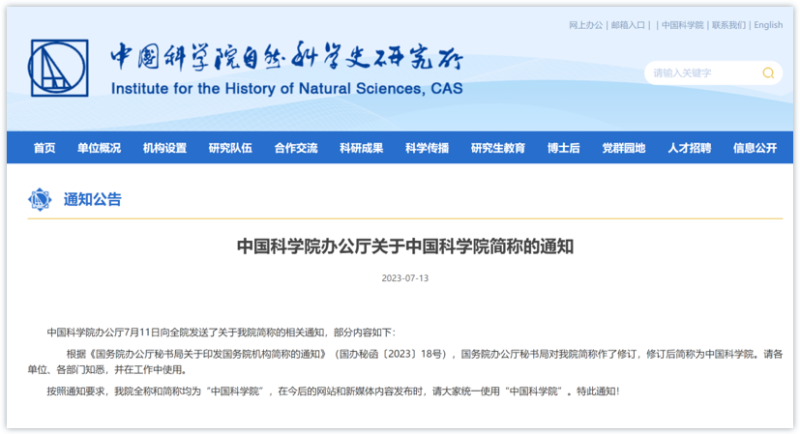 中国科学院办公厅7月11日向全院发送了关于我院简称的相关通知,部分内容如下: