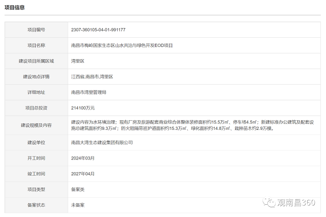 项目建设单位为南昌大湾生态建设集团有限公司,项目开工时间2024年3月,2027年04月。