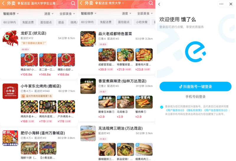 与饿了么的合作则为抖音提供了一些主打正餐时间段的商家供给。