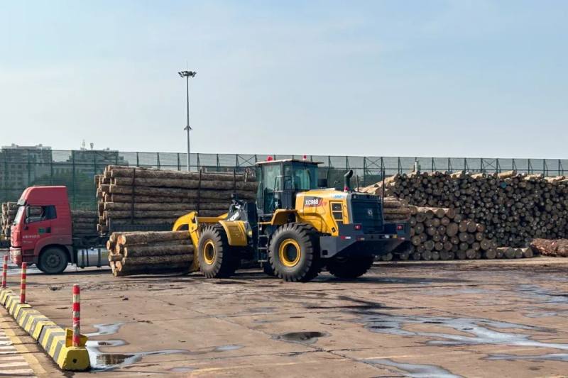 一艘满载原木的货轮刚刚靠岸,20台徐工XC968 I夹钳机迅速启动、排列有序登上甲板,将原木从入港船舶上夹起转运至等待装运的卡车,动作一气呵成。