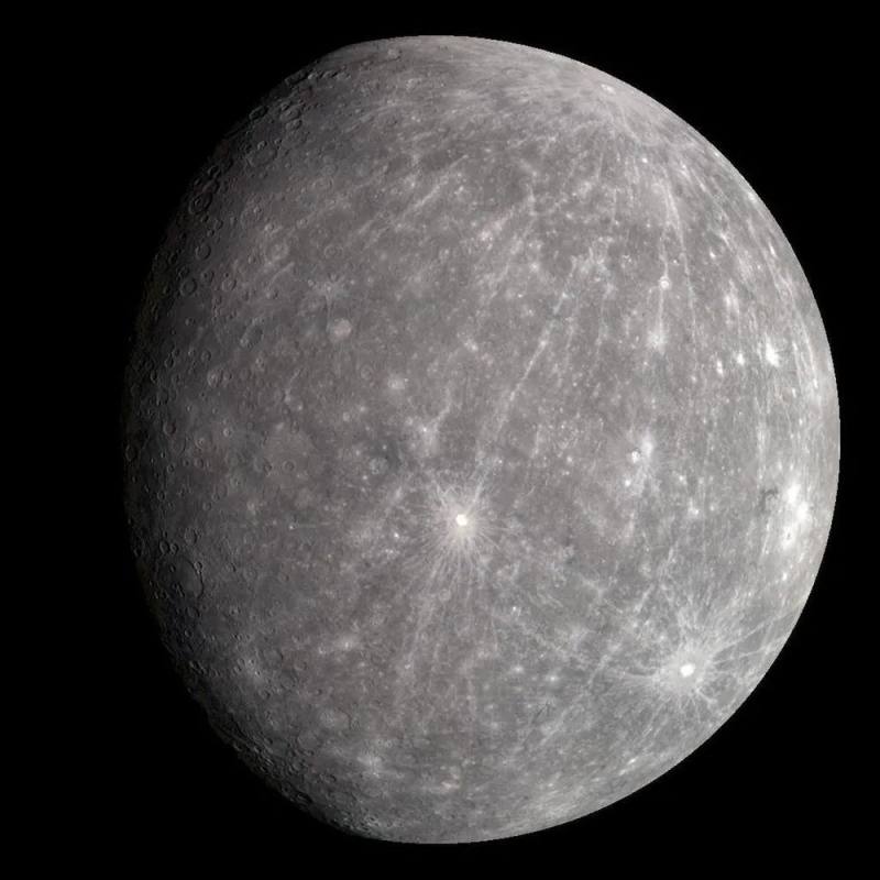 信使号于2008年10月6日飞掠水星期间,在距离水星表面27000千米高度处拍摄的水星图像之一。图片来源:NASA/Johns Hopkins University Applied Physics Laboratory/Arizona State University/Carnegie Institution of Washington