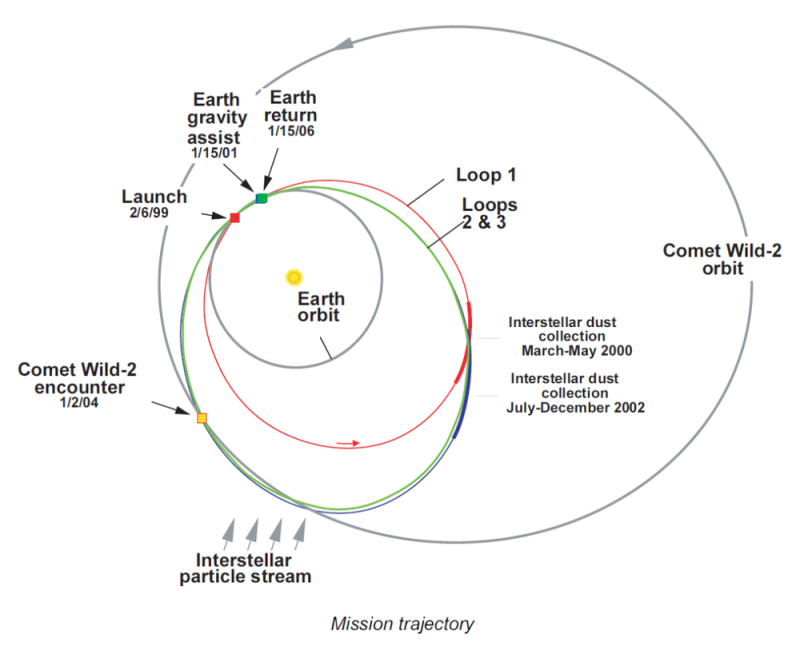 5. 沿蓝轨道运行,于2004年1月2日与怀尔德2号(Wild-2)彗星相遇(黄方块所示),采集后者物质;