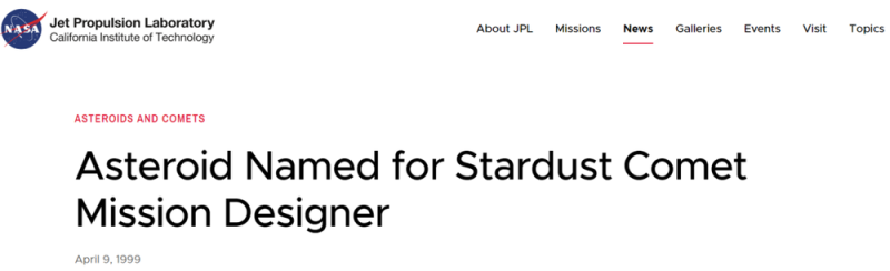 1999年4月9日,NASA的JPL官网发布新闻,标题是《以星尘号彗星任务设计者命名小行星》(Asteroid Named for Stardust Comet Mission Designer)。图片来源:参考文献[1]的截图