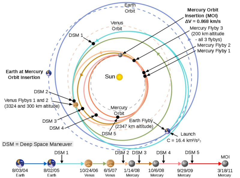 信使号的轨道,6次飞掠(flyby)与5次深空机动(DSM)也被分别标出。MOI为水星轨道插入(Mercury Orbit Insertion)的缩写。图片来源:NASA