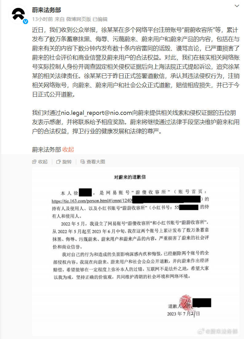 蔚来在核实相关网络账号实际控制人身份并调查固定相关侵权证据后向上海法院正式提起诉讼,追究徐某某的相关法律责任。徐某某已于昨日正式签署道歉信,承认其违法侵权行为,注销相关网络账号,向蔚来、蔚来用户和社会公众正式道歉,赔偿相应损失,并已正式公开道歉。