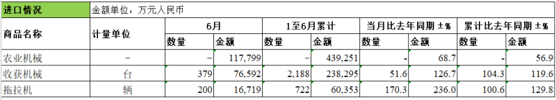 拖拉机方面:进口数量为200辆,进口金额为16,719万元;当月进口数量比去年同期增长170.3%,当月进口金额比去年同期增长236%;1至6月累计进口数量为722辆,累计进口金额为60,353万元;累计进口数量比去年同期增长100.6%,累计进口金额比去年同期增长129.8%。