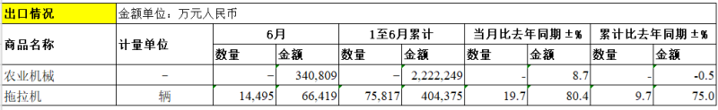 拖拉机方面:出口数量为14495辆,出口金额为66,419万元;当月出口数量比去年同期增长19.7%,当月出口金额比去年同期增长80.4%;1至6月累计出口数量为75817辆,累计出口金额为404,375万元;累计出口数量比去年同期增长9.7%,累计出口金额比去年同期增长75%。