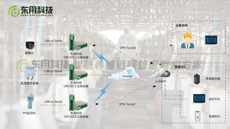 1.工业级无线蜂窝网VPN路由器具备全网通通信模块和百兆网口,支持多种工业数据传输需求,养殖场可以快速建立可靠的数据传输通道,将养殖数据从传感器和设备传输到管理平台,实现远程监控和数据分析。