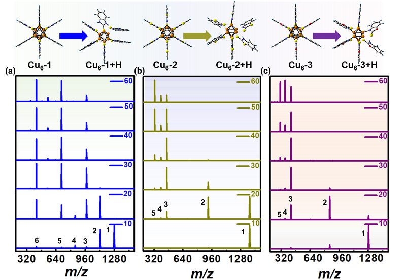 图2. 三种不同配体Cu6团簇结构和多级质谱分析