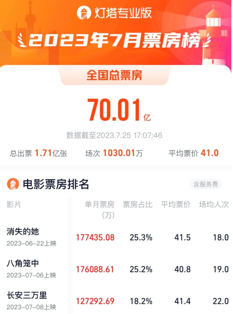 排名方面,电影《消失的她》持续领跑 7 月票房榜,《八角笼中》《长安三万里》居第二、三位。