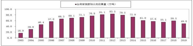▼图二:台湾家庭厨余垃圾分类收集量(2003-1019年)万吨
