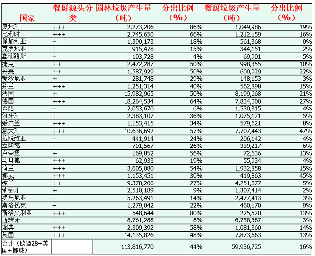 ▼图一:欧盟28+英国+挪威园林垃圾/餐厨垃圾分出比例