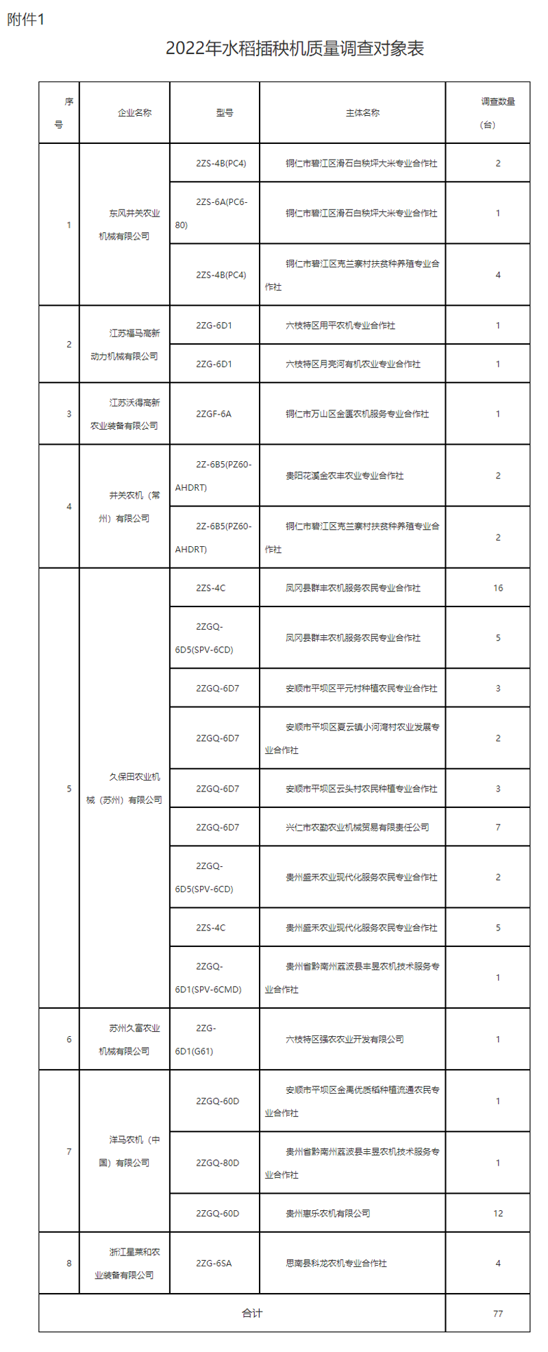 (四)调查数量:共调查8家生产企业生产的77台水稻插秧机,其中手扶式插秧机28台、乘坐式插秧机49台(详见附件1)。