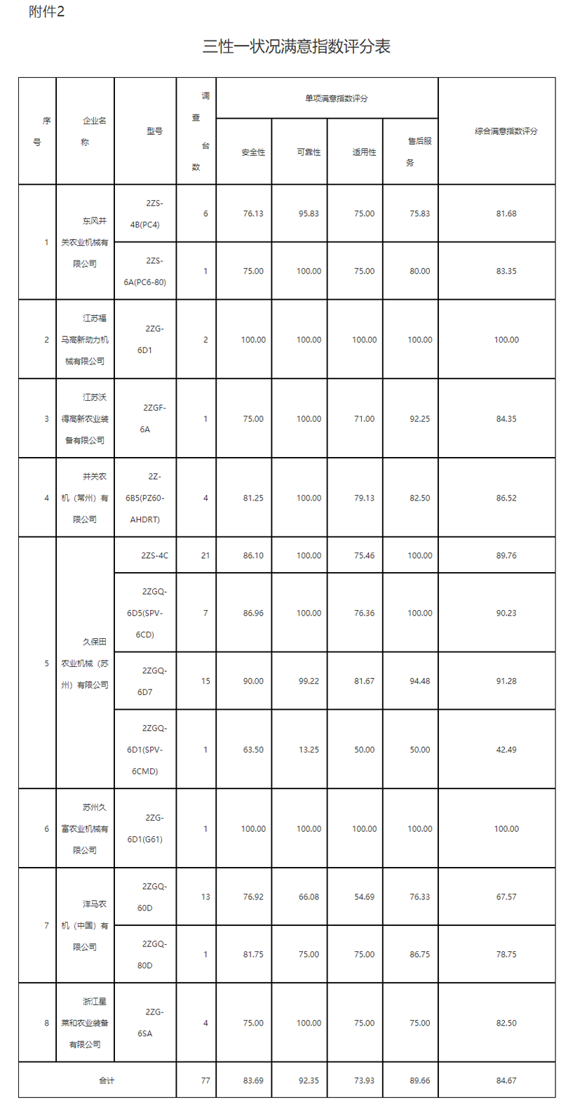 (五)调查方法:采取用户满意度评价方法进行,用户对安全性、可靠性、适用性、售后服务状况(以下简称“三性一状况”)进行满意度评价打分,经座谈交流、现场查看、核验确认,得出单项满意度评价;在此基础上,按满意指数评价方法作出相应型号产品“三性一状况”单项满意指数和水稻插秧机总体满意指数评价(详见附件2)。