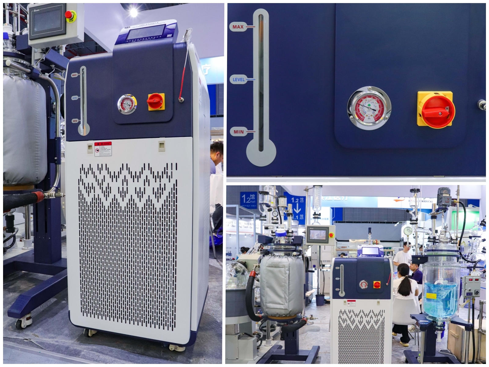 巩义予华在本次展会上的明星产品是GDSZ(EX)-10040-EXTSX 高低温一体机。高低温一体机又叫高低温循环泵、加热制冷一体机、高低温循环一体机,专门用于给反应釜做升降温。巩义予华在高低温一体机上实现了技术突破,克服了传统高低温一体机油槽体积大、容易吸收水汽影响盘管蒸发器导热、导热油挥发后冷凝堵塞通风橱的过滤器等缺陷。