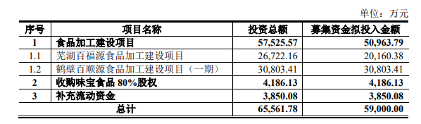 公告显示,千味央厨拟向特定对象发行股票募集资金总额不超过5.9亿元,所募资金拟用于食品加工建设项目(芜湖百福源食品加工建设项目、鹤壁百顺源食品加工建设项目(一期))、收购味宝食品80%股权、补充流动资金等。
