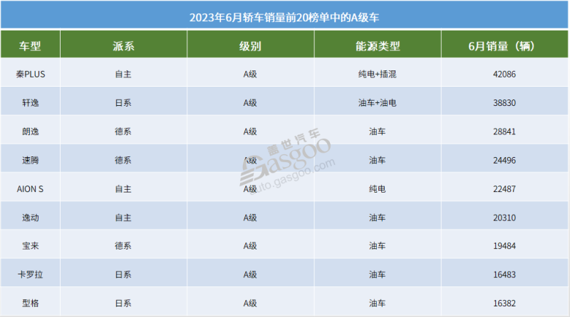 国内A级家轿市场的整体格局相对稳定,热销的产品基本上都是大家的熟面孔,毕竟这个细分市场的体量最大,能够热销的产品,都是经历过终端用户千挑万选的车型,想要意外“爆冷”的难度,不是一般的大。6月进入轿车销量前20榜单的A级车共有9款,而且分散的很平均,自主和德系、日系各占了3个席位。