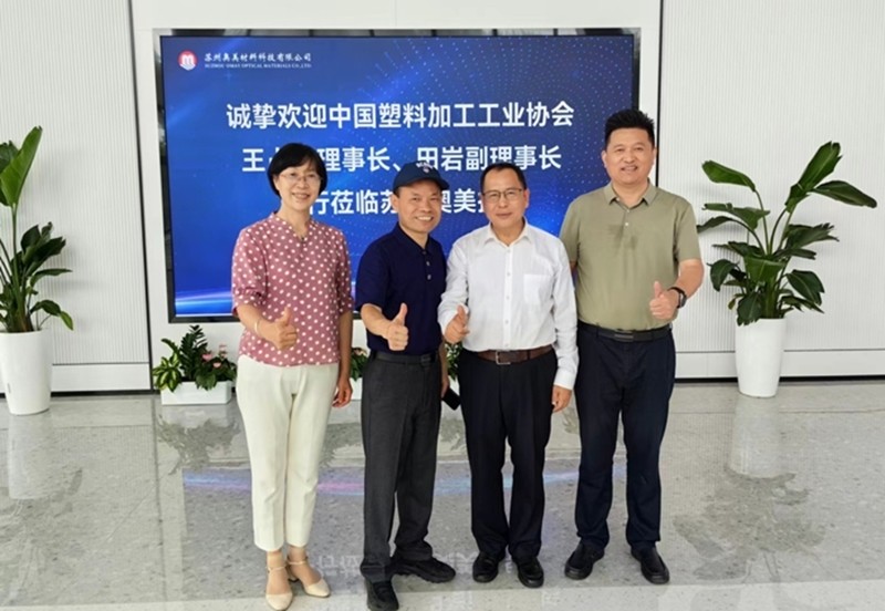 王占杰理事长一行还来到中国塑料加工工业协会常务理事单位、中国塑协板片材专业委员会主任单位——苏州奥凯材料技术有限公司,参观了公司展厅和生产车间并与朱山宝总经理、马青赛副总经理等进行座谈交流。
