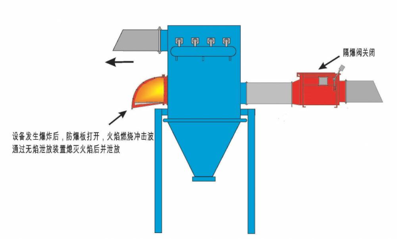 火焰在通过网状阻火元件时,阻火元件与火焰进行热交换,迅速将高温火焰冷却,泄放压力和烟气,保-证火焰不被传播,进而造成二次暴炸或多次暴炸,同时,生产设备产生的压力波或噪音也会降低程度。工业生产中,无焰泄暴装置与隔爆阀的组合使用不但有效防止压力波和火焰传播到上游车间的生产场地,而且遏制了二次暴炸事故的发生,降低了财产损失和保护了人员安全。