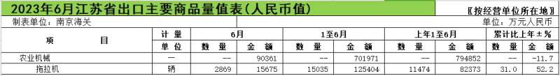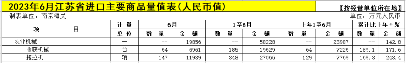 【农机网 市场行情】近日,南京海关公布2023年6月江苏省进出口主要商品量值表。其中,农业机械方面详细情况如下: