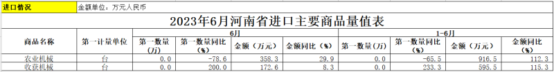 6月,河南省农业机械进口金额为358.3万元,同比增长29.9%。1-6月累计进口数量同比下降65.5%;累计进口金额为916.5万元,同比增长112.3%。