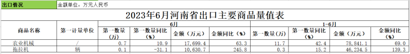 【农机网 市场行情】据郑州海关统计,今年上半年,我省外贸进出口总值3799.5亿元,比去年同期(下同)下降3.4%。其中,出口2505.8亿元,增长2.4%;进口1293.7亿元,下降13%。近日,郑州海关公布2023年6月河南省进出口主要商品量值表。其中农业机械方面进出口情况如下: