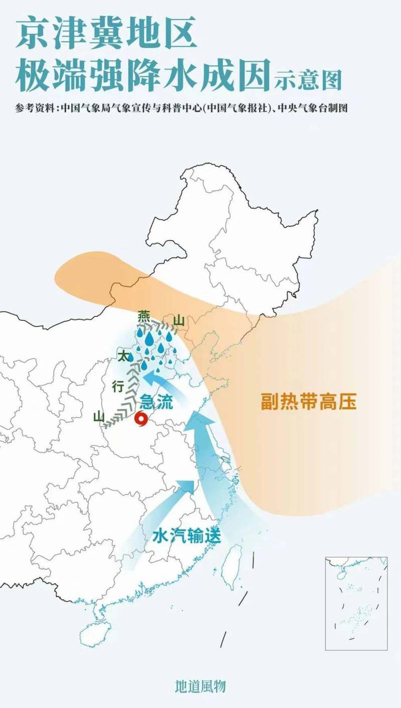 这样的地理条件在冬季,燕山与太行山山脉对于冷空气有着截停作用,“庇佑”了在山脚居住的人们。但同时在夏天,雨水也会被阻挡、汇集到了这块“风水宝地”上,尤其是位处太行山东坡及燕山南坡的房山、门头沟等地影响最深。