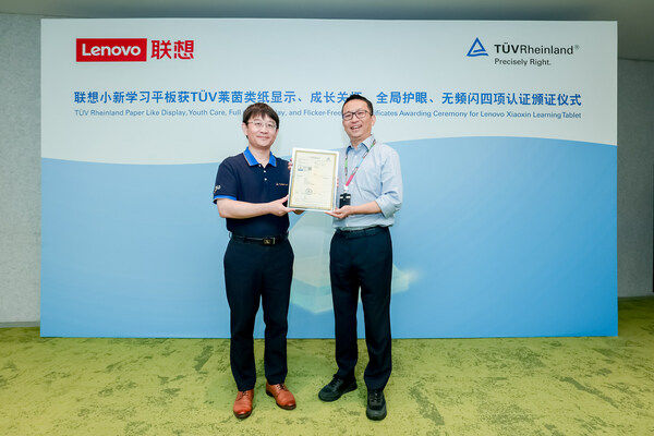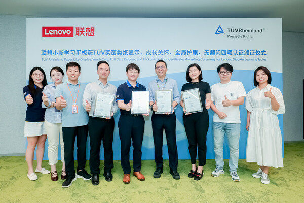 联想小新学习平板获TÜV莱茵类纸显示、成长关怀、全局护眼、无频闪四项认证证书