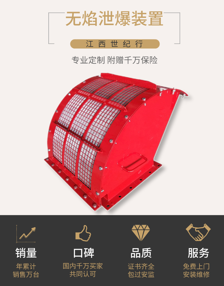 无焰泄放装置由两部分组成,防 爆板和灭火模块。防 爆板对爆燃压力快速升高作出反应,立即打开以减少压力。当膨胀的火球通过打开的防 爆板时,被灭火模块拦截。有框架支撑的不锈钢精密网丝发挥三维火焰捕捉作用,扑灭火焰。灭火模块消 除爆燃的火焰、降低热气体温度,以及捕捉通过开启的防 爆板的燃烧和未燃烧的粉尘。