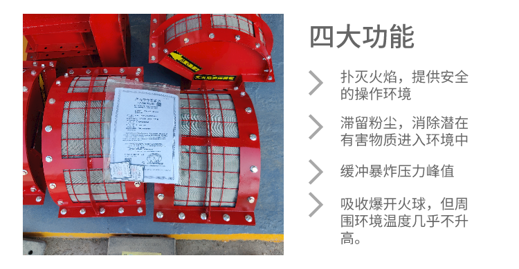 火焰在通过网状阻火元件时,阻火元件与火焰进行热交换,迅速将高温火焰冷却,泄放压力和烟气,保证火焰不被传播,进而造成二次爆炸或多次爆炸,同时,生产设备产生的压力波或噪音也会降低。