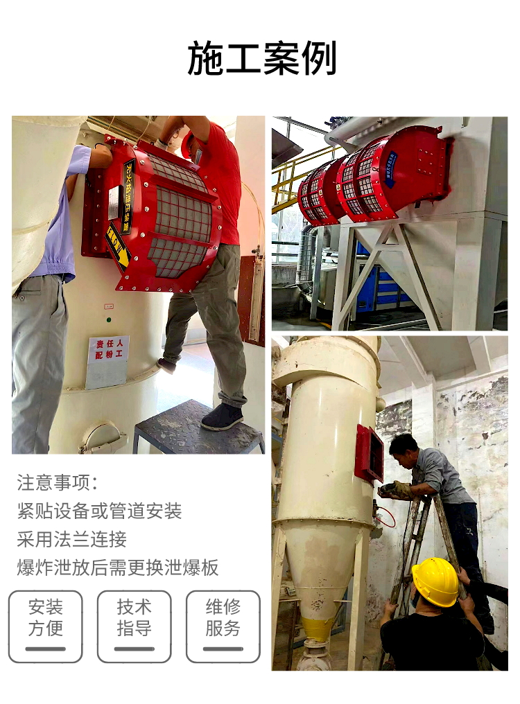 降低粉尘爆炸风险的一种方法是使用爆炸性压力释放(防爆门)技术。它的重要作用是在很短的时间内发生爆炸后暂时或 地保护原本封闭的容器和设备。开启措施考虑到释放的物质是否具有腐蚀性或毒性,在封闭空间内产生的爆炸性物质通过泄爆装置释放。