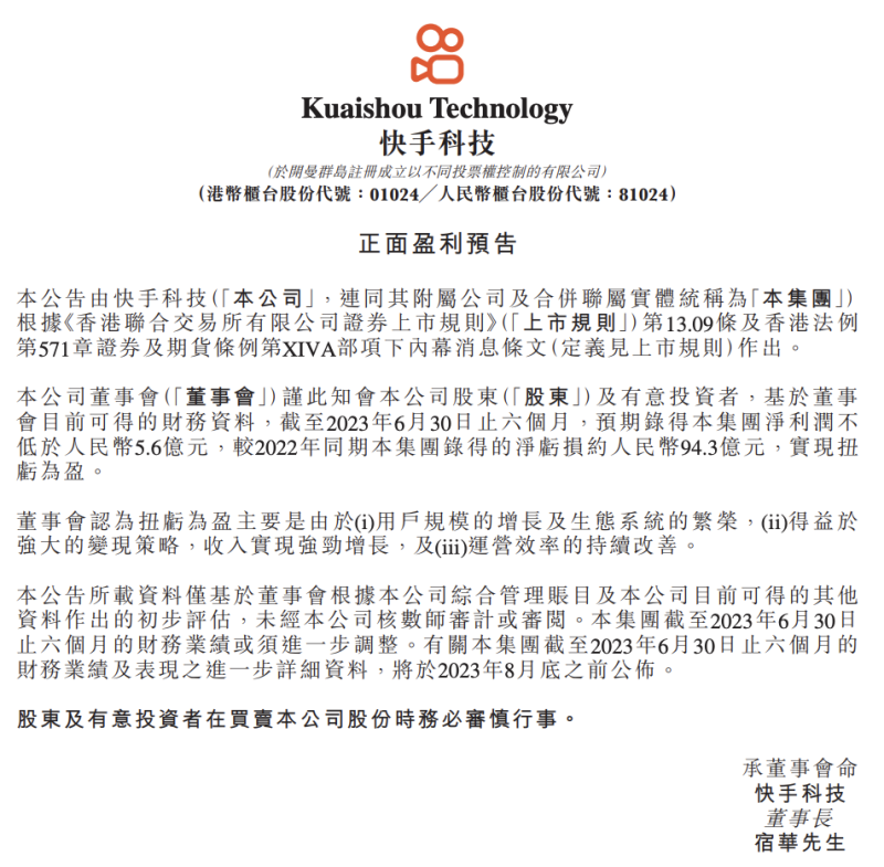 7月31日,快手发布了2023年上半年盈利预告,公告显示,2023年上半年,公司预计录得净利润不低于5.6亿元,较2022年同期的净亏损94.3亿元实现扭亏为盈。