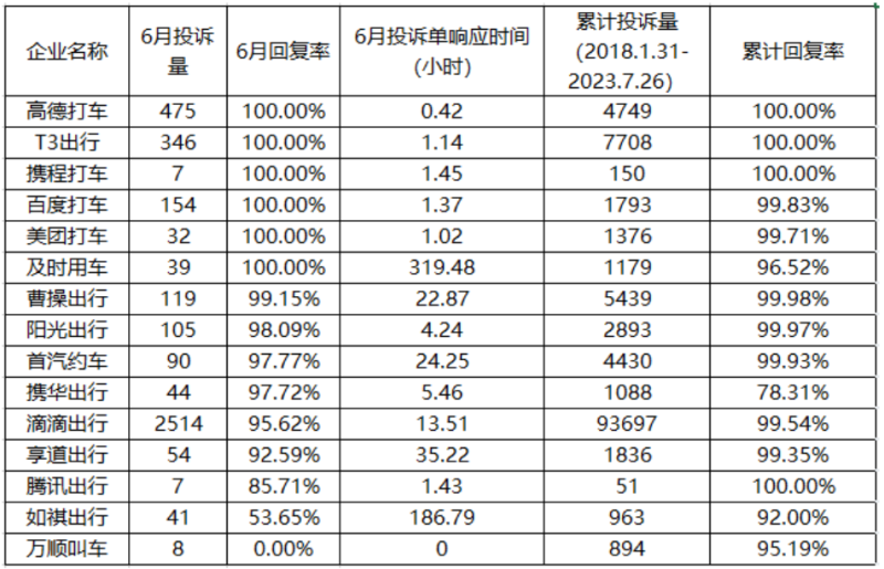 网约车平台6月投诉数据对比:4家聚合平台回复率100%