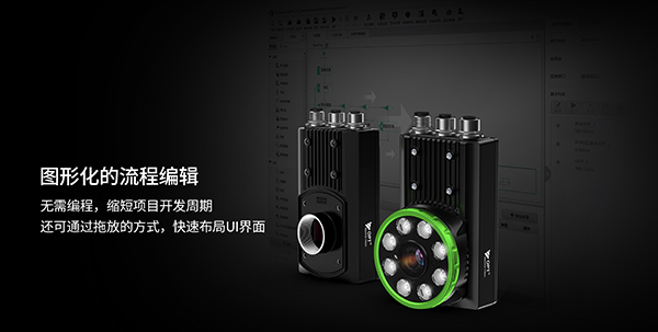 SC系列智能相机采用图形化的流程设计,用户无需使用编程,通过参数配置,即可快速实现视觉应用;还可通过拖放功能控件的方式,快速实现UI界面布局,不仅操作简单,而且还节省大量编写代码程序时间,项目开发周期更短。
