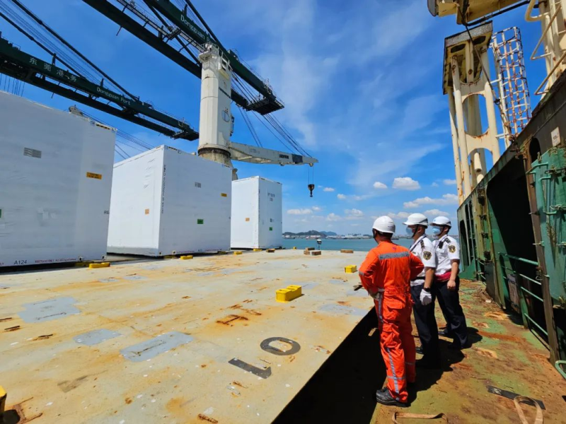 “本次出口大件较以往有很大不同。这批产品代表了目前中国工程建设产品的顶尖水平,国外项目部对此非常重视。由于重型工程设备装载作业难度大,加上台风天气复杂多变,货物的装载、压载、系固绑扎、稳性调整等安全作业都十分重要。”东莞沙田海事处执法人员吴焰宏表示,海事部门每天巡查船舶作业情况,利用CCTV、AIS等对货物装载过程实时监控。