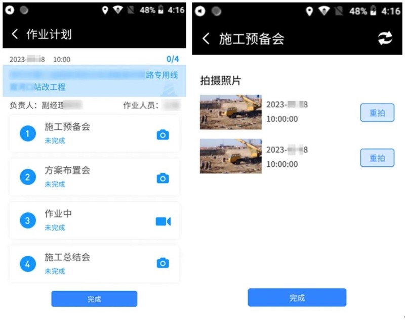 平台管理人员可一键导入项目计划表,批量创建任务,系统自动提取表内关键字段信息,自动派发至各前端监理人员的作业记录仪终端。当作业记录仪收到下发的任务计划时,会实时语音提醒。监理人员即可通过作业记录仪完成作业计划流程,分别对施工预备会、方案布置会、作业中、施工总结会各个流程进行拍照及视频记录,一键上传至平台,实现工作任务流程化、工作过程全纪录,提高监理人员的工作效率,保证监理工作的规范性和质量。