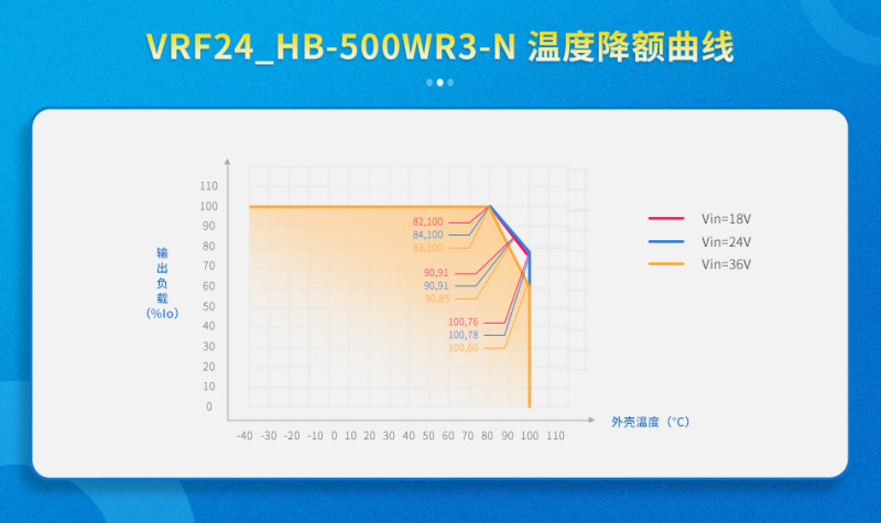 大部分开关电源对工作温度范围的需求在-40 to +70℃,温度性能对于产品稳定性有着不可忽视的影响,VRF24_HB-500WR3系列产品可实现工作温度范围 -40 to +100℃(壳温),同时,满足80℃壳温下可带满载的优良性能。