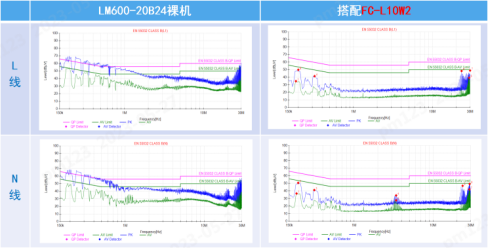 针对电源产品应用前级带来的共差模干扰问题,EMC辅助器FC-LxxWx系列产品基于二阶滤波方案,共差模抑制效果高达60dB,可有效抑制前级的干扰,提升LM系列电源产品传导等级(CLASS A→CLASS B)。