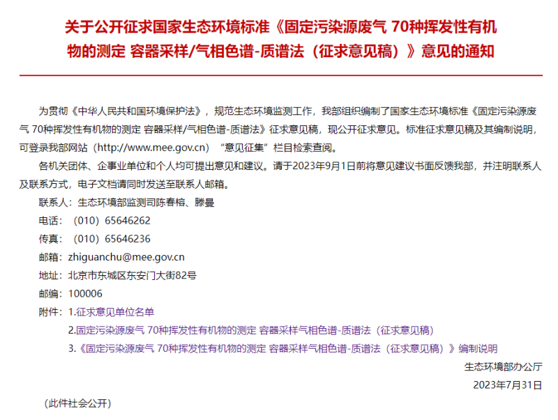 近日,生态环境部组织编制了国家生态环境标准《固定污染源废气 70种挥发性有机物的测定 容器采样/气相色谱-质谱法》征求意见稿,现公开征求意见。