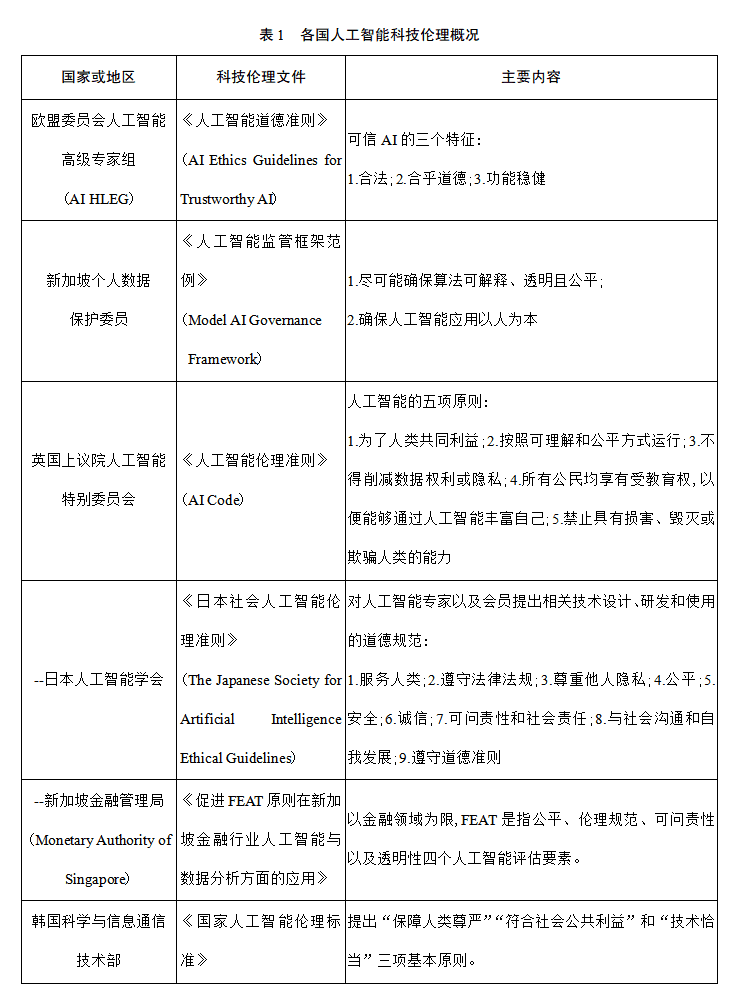 此外,面对ChatGPT等人工智能应用产生的新兴技术风险,域外各国也纷纷开启了科技伦理治理路径(参见下表),其内容在伦理目标层面具有相似性,均是以公共利益和人类尊严为基础,不过部分国家囿于技术创新的考量,仅仅是在伦理规范层面提出相应的道德标准。