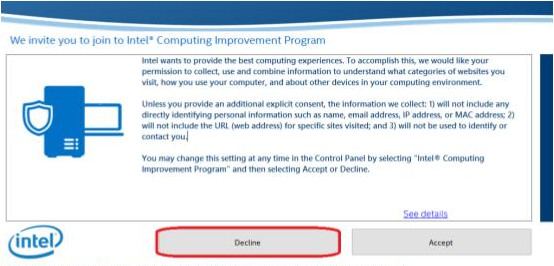 5.在 Intel Computing Improvement Program 窗口中,单击拒绝。