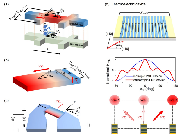 图2. 各向异性平面能斯特效应对(a)谐波霍尔电压、(b)自旋塞贝克、(c)自旋扭矩-铁磁共振等自旋电子实验的广泛影响及其在(d)热电器件方面的应用案例。